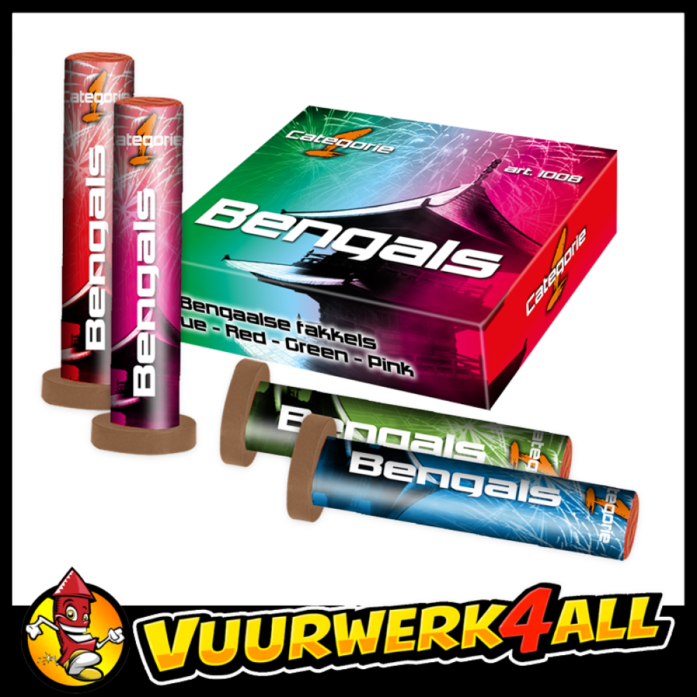 Bengals, per 4 stuks in een doosje. De Bengals zijn geweldig heldere Bengaalse vlammen in vier verschillende kleuren. Het effect lijkt op een fontein, met een super heldere gekleurde vlam. Deze set bestaat uit de kleuren Rood, Roze, Groen en Blauw.