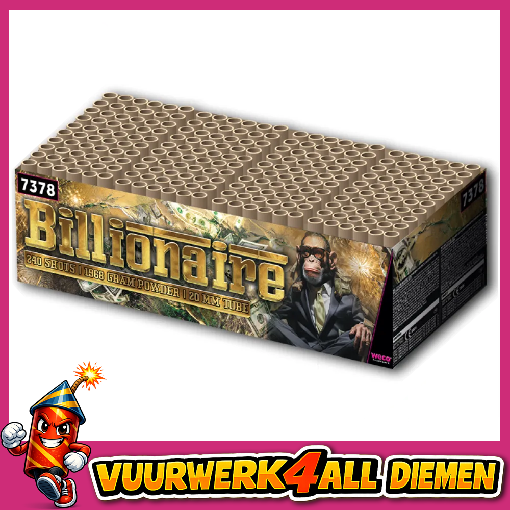 De Billionaire van WECO Feuerwerk geeft je een heerlijk rijk gevoel. De Billionaire is een 240 shots compound met 20mm tubesize. Deze compound zit ruim in zijn schoten welke ritmisch in salvos worden afgevuurd. Het mooiste goud met de helderste blinkers en mooiste kleuren verzorgen een spectaculair geheel. Door zijn 240 schoten een goede tijdsduur met voldoende actie om de menigte te blijven entertainen.