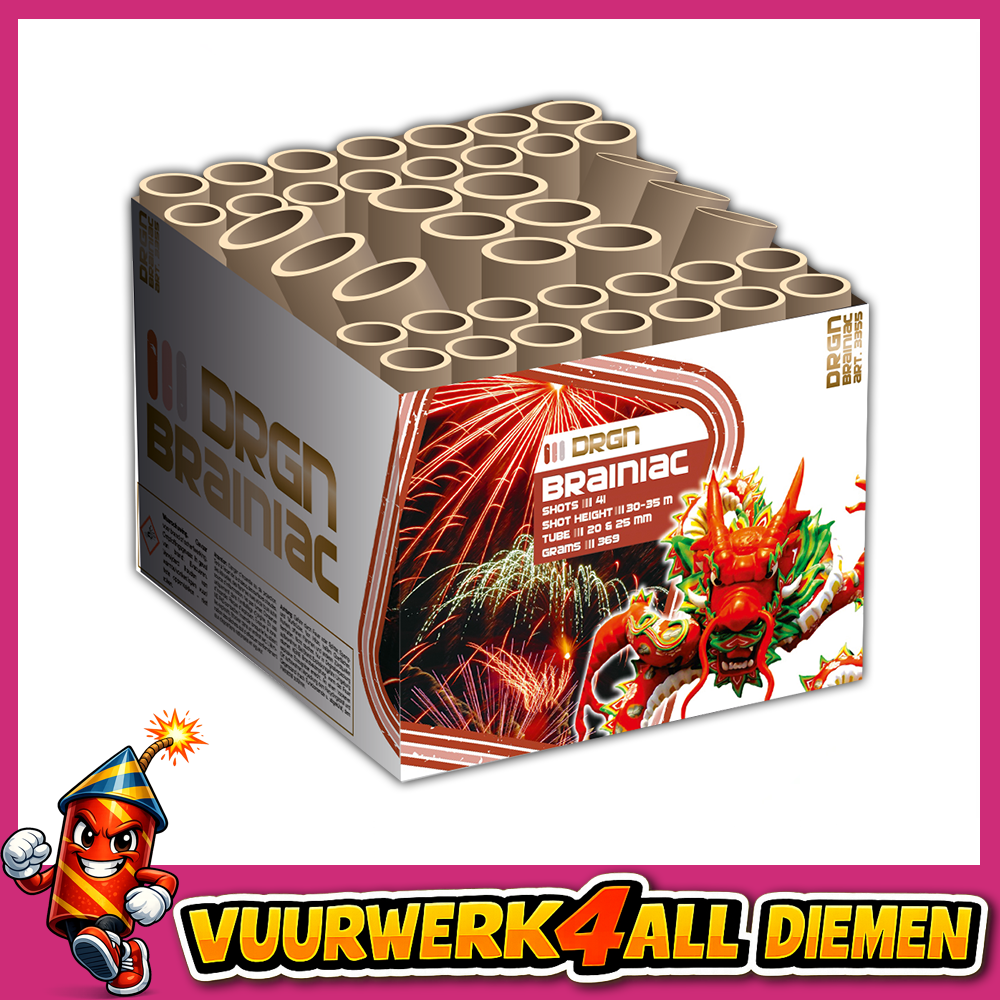 DRGN Brainiac, 41 shots 25mm cake. Deze Braniac laat zijn kwaliteiten zien met zijn 41 schoten gewaagd siervuurwerk. Met gouden palmen met gekleurde briljanten, en V-shape stijl glitterpalmen welke opstijgen met een befaamde draaiende staart en een spider-stijl finale zeer indrukwekkend.