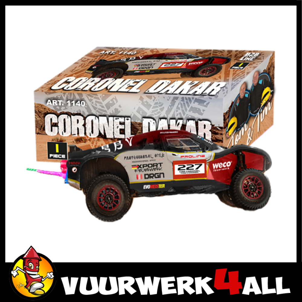 Elk jaar na de jaarwisseling start de zeer bekende Dakar Rally. Onze vuurwerkvrienden van Coronel zijn al jaren vaste deelnemers van deze zware Dakar Rally. In samenwerking met het Dakar team van Coronel is deze miniatuur van hun Dakar auto in vuurwerk ontwikkeld. Na het aansteken zal de Coronel Dakar auto er vandoor schieten in Coronel-stijl.