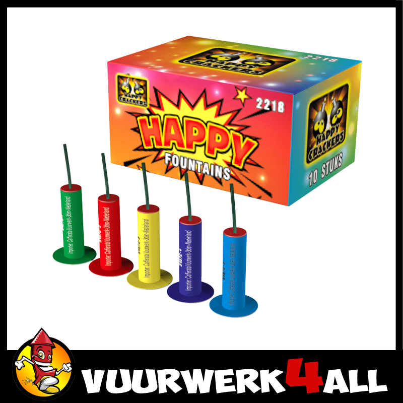 Tien kleine fonteintjes die rode, gele, blauwe, paarse en groene sterren de lucht in spuiten. Voor fonteinen van dit formaat een verrassend grote uitwerking!
