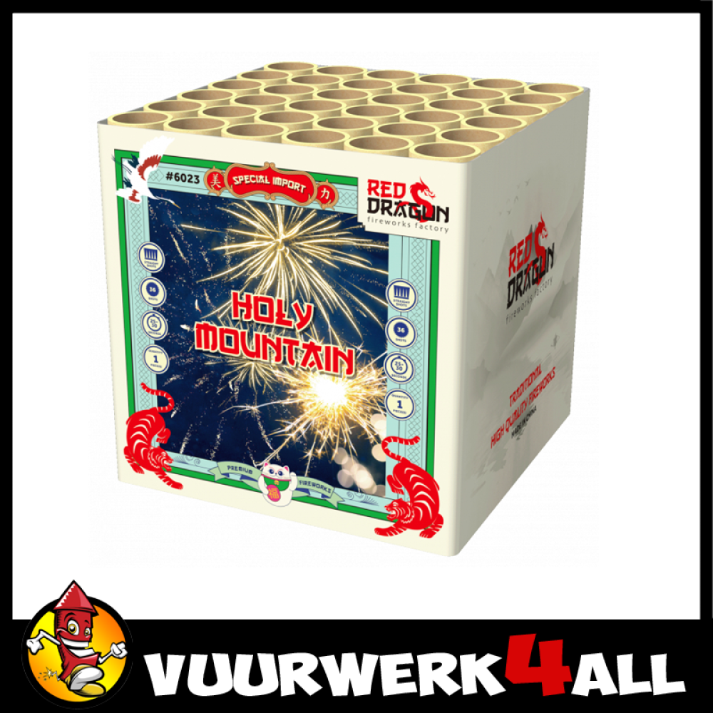 Maar liefst 36 schoten, maximaal gevuld met 500 GRAM kruit! De Holy Mountain is écht voor de liefhebber van knettereffecten. Heftige crackling mijnen gevolgd door kleurrijke dahlia’s met crackling. Een ware crackling sensatie!