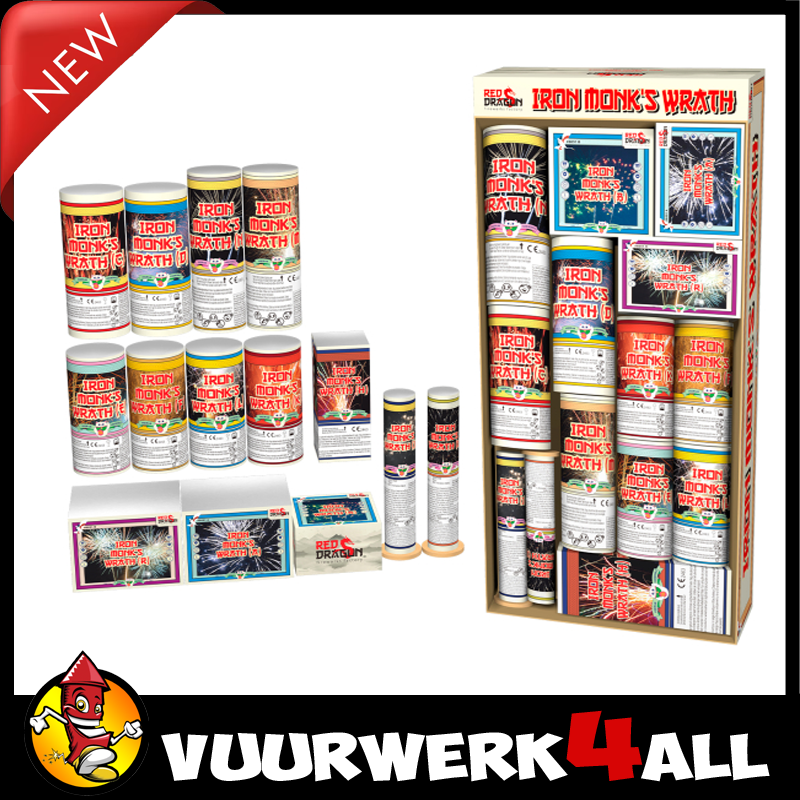 Voor wie groots wil afsluiten met stijl. De grotere broer in de oosterse lijn. Iron Wonk’s Wrath combineert 8 fonteinen, een vierkante fontein, 3 cakes en 2 mines tot één indrukwekkend sierpakket.