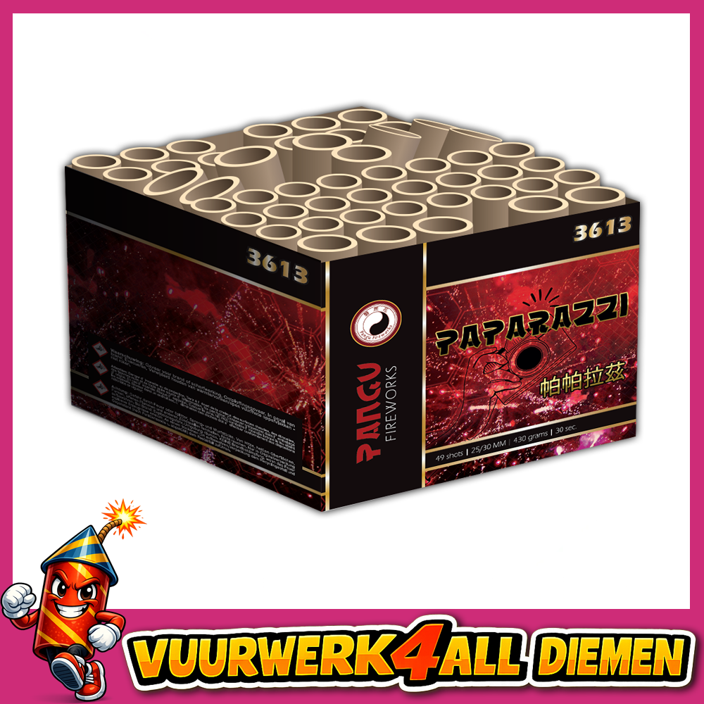 Paparazzi is een cake met 49 schoten in de tubesize 25mm en de maximale tubesize van 30mm. Door zijn geweldige effecten zal de buurt zich als Paparazzi om deze cake heen verzamelen, en genieten van vele schitterende kleuren en goudcombinaties. Deze cake schiet zowel I-shape als fanshape gegarandeerd genieten!