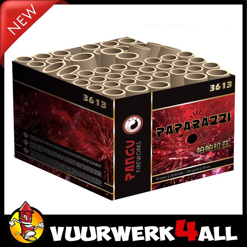 Paparazzi is een cake met 49 schoten in de maximale tubesize van 30mm. Door zijn geweldige effecten zal de buurt zich als Paparazzi om deze cake heen verzamelen, en genieten van vele schitterende kleuren en goudcombinaties. Deze cake schiet zowel I-shape als fanshape gegarandeerd genieten!