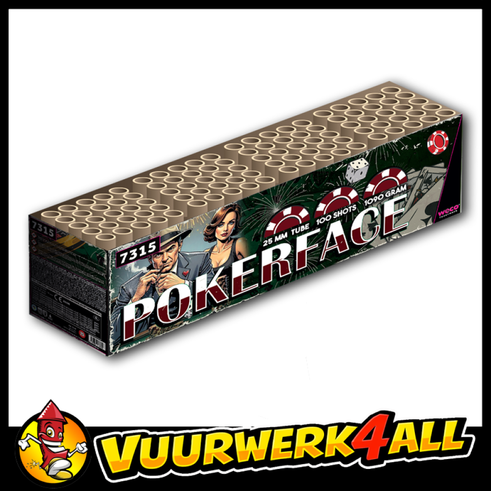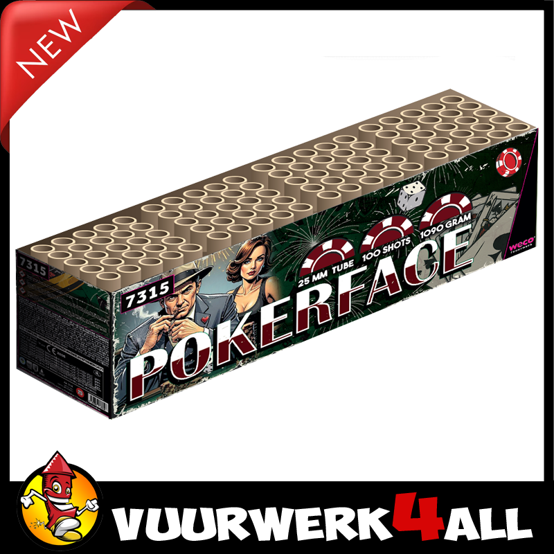 Deze Pokerface van WECO zet het spel op scherp. Compound met 100 schoten 25mm kaliber siervuurwerk. Heerlijke spider met roze parels afgewisseld met geweldige two-tone gouden palmen met witte blinkende toppen, bouwen steeds sneller op tot een geweldig einde!