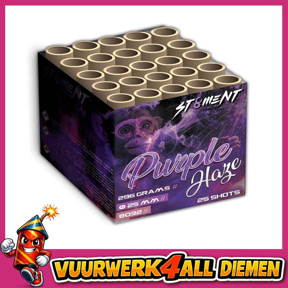 Purple Haze is een siercake met 25mm tubesize en 25 schoten. Het hoofdeffect van deze Purple Haze is paars met heldere witte ghosts. Een heerlijke combinatie.