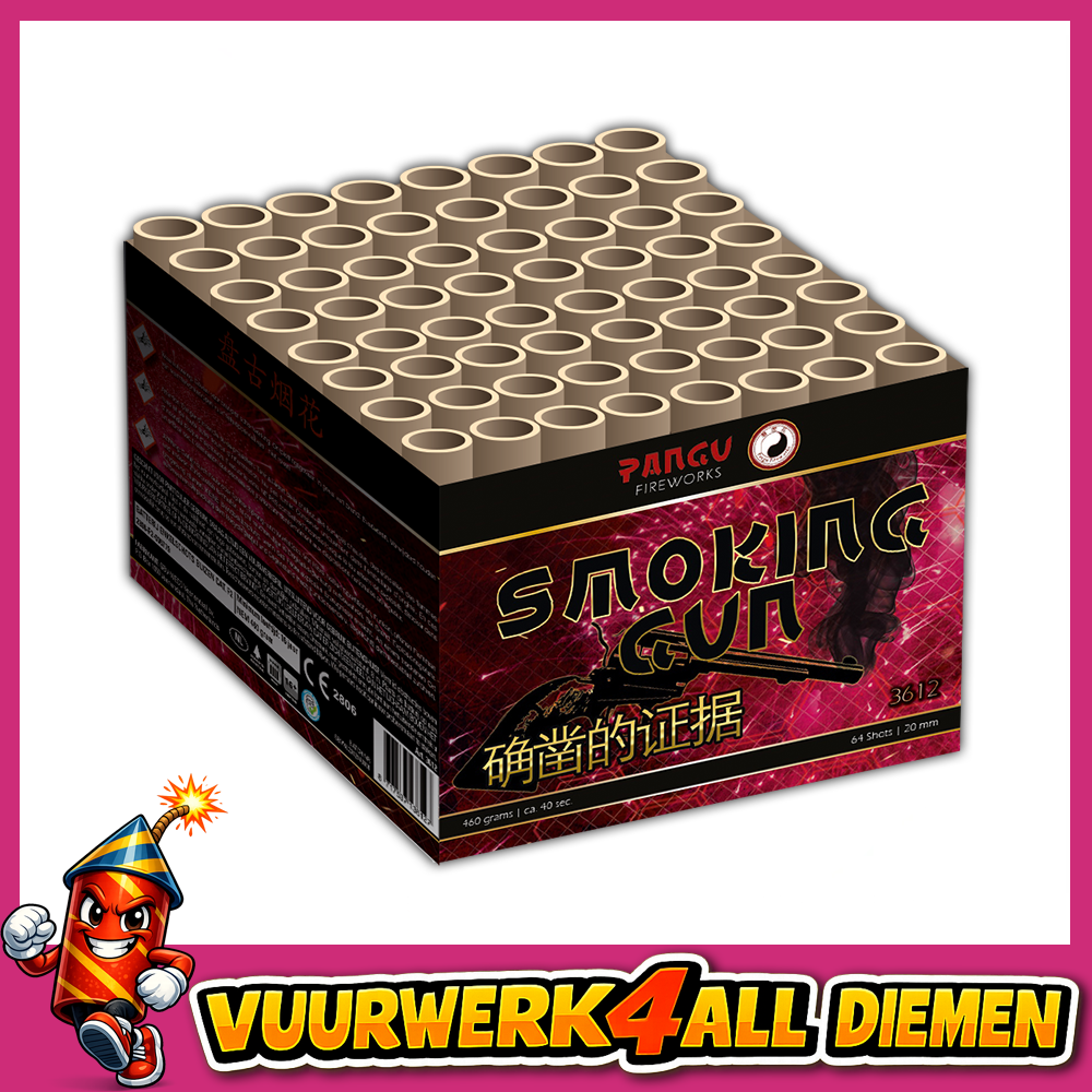 Smoking Gun, 64 shots 20mm cake. Met deze cake uit de serie van Pangu Fireworks haalt u maar liefst 64 schoten siervuurwerk uit een relatief klein product. Afgewisseld schiet deze cake heldere blinkers, heftige crackling tails, gouden palmen, glitter palmen en een finale salvo met heftige crackling de hemel in. Een top cake in zijn diversiteit.