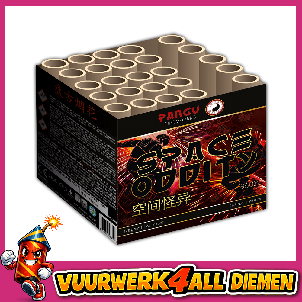 Space Oddity, 25 shots 20mm cake. Deze siercake uit de Pangu Fireworks collectie schiet heldere blinkers, gekleurde parels en een knetterende crackling finale salvo.