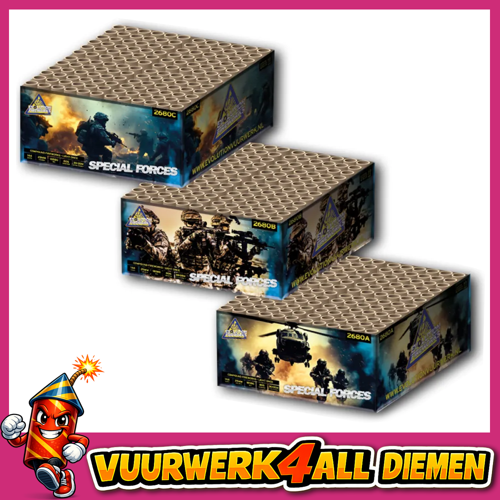 Met een knipoog naar een welbekende oude topper, de EVO Force One, heeft de vuurwerkfabriek van Evolution Fireworks deze nieuwe set Special Forces ontwikkeld. Deze compoundset bestaat uit drie delen van ieder 144 schoten in 25mm tubesize. Het totaal van deze complete vuurwerkshow zit hierdoor op maar liefst 432 schoten! Dit is gewoon puur genieten!