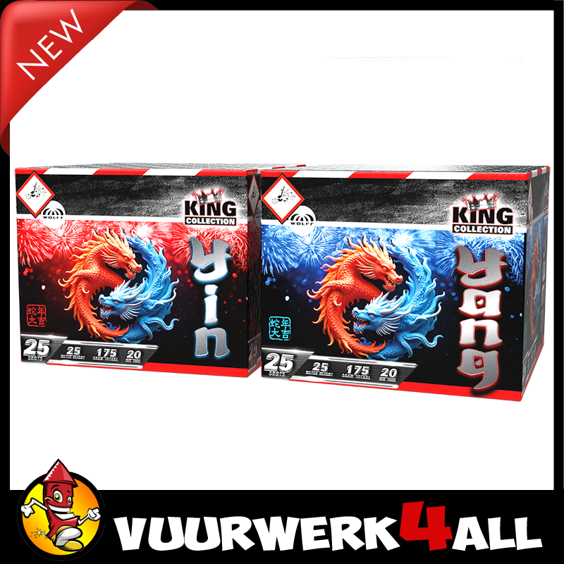 Dubbel plezier met de Yin & Yang! Twee cakes van 25 schoten met kleurrijke effecten. Perfect voor een knallende jaarwisseling.